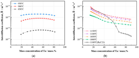 The of Ti–Ta at different diffusion temperatures: (a) 850~950 °C, (b) 1000~1150 °C.