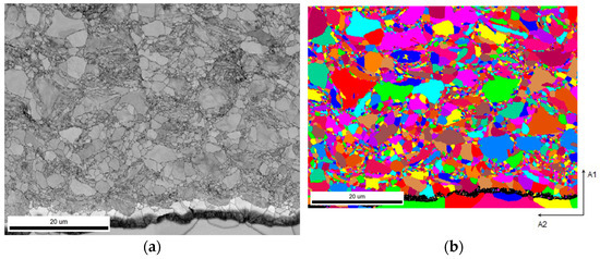 EBSD of as-sprayed Ta coating diffused at 900 °C for 0.5 h: (a) image quality (IQ) map; (b) grain size map.