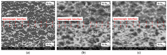 Figure 8 illustrates the microstructural morphology of as-sprayed, unencapsulated and encapsulated HIPed Ti–Ta graded coatings. Compared to the distinct microscopic interface between Ti and Ta particles in the as-sprayed coating, obvious diffusion zones can be observed after HIP at 900 °C both with and without capsulation. Moreover, the macroscopic interface also transformed into metallurgical bonding by means of diffusion. The detailed microstructure of the interdiffusion zone is presented in Figure 9. The α-phase zone around Ti and the β-phase zone adjacent to Ta is separated by a layered distribution of the (α+β) biphasic zone, where the bright and light gray areas are β- and α-phase, respectively [19]. Unlike the Ti–Ta composite in reference [18,43,44], the HIPed Ti–Ta coatings in this study retained some pure Ti and Ta regions. Meanwhile, no significant Kirkendall voids could be found in the encapsulated HIPed samples. It could be expected that such characteristic can enhance the wave attenuation performance [6,7].