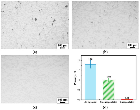 OM images of Ti–Ta1.5 coatings: (a) as-sprayed; (b) unencapsulated HIPed; (c) encapsulated HIPed; (d) porosity of different coatings.