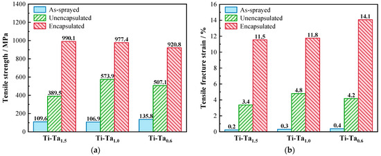 Figure 11 shows the quasi-static tensile properties of as-sprayed and HIPed Ti–Ta coatings. The tensile strength and fracture strain of as-sprayed Ti–Ta1.5 are about 100 MPa and less than 1%, exhibiting a typical brittle fracture similar to that of the cold-sprayed pure Cu, Ti, stainless, and composite coatings [12,13,14,15]. After unencapsulated HIP, although the tensile strengths of Ti–Ta1.5 were improved significantly to about 389.5 MPa, the fracture strain (3.4%) was still far below that of the pure Ti or Ta. It is noteworthy that Ti–Ta1.5 exhibited excellent tensile properties after encapsulated HIP, with a tensile strength of 990.1 MPa, which is about eight times that of the as-sprayed sample. Meanwhile, the fracture strain also increased from less than 1% to 11.5%, which is similar to the pure Ti.