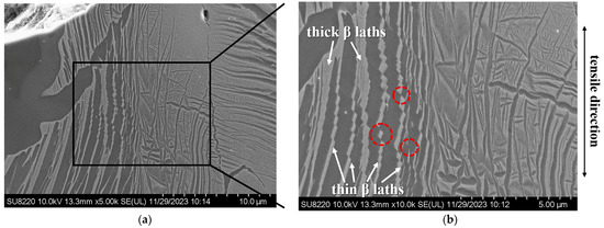 Another interesting phenomenon is that the tensile strength of the encapsulated HIPed Ti–Ta composite coatings was much higher than that of pure Ti and Ta. This strengthening relates to the diffusion region in the Ti–Ta coatings. Figure 13 shows the cross-sectional microstructures of the diffusion zone near the tensile fractured surface in the encapsulated HIPed Ti–Ta1.5 coating. It can be observed that the precipitate phases in the diffusion zone were bent under the tensile loading. The partially thin lath-like β-phases were completely cut off or formed obvious slip steps, while the thick, lath-like β-phases with acicular-like α-phases have less deformation and remain intact. Such a result indicates that the phase interface can hinder the slip of dislocations, while thick β-phases with fine acicular α precipitates are more effective [48,49]. In addition, solid-solution strengthening and fine-grain strengthening may also improve the strength to some extent [43,44].