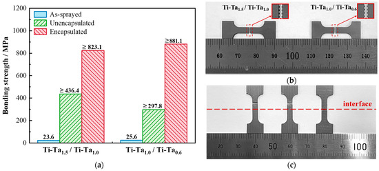 Bonding strength and fracture location of Ti–Ta graded coating: (a) bonding strength; fracture location in (b) as-sprayed and (c) HIPed graded coatings.