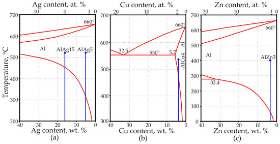 Phase diagram fragments in the low-concentration regions of alloying components: (a) Al–Ag, (b) Al–Cu, (c) Al–Zn [66].