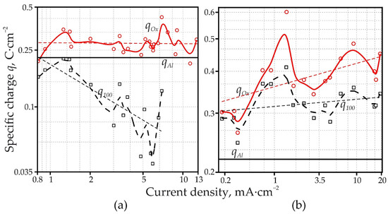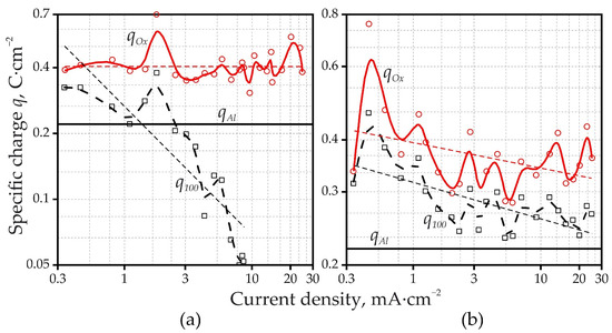 Dependences of specific charge qAl, q100 and qOx on the anodic current density for AlCu4 oxide obtained from (a) BA anodizing and (b) CB anodizing (bilogarithmic coordinates).