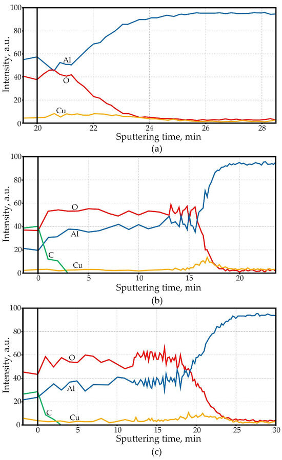 AES element distribution profile of AlCu4 oxide obtained from (а) BA full anodizing at 9.1 mA·cm−2, (c) BA full anodizing at 1.43 mA·cm−2 and (b) BA 100 V anodizing at 1.43 mA·cm−2. In the case of full anodizing, the anodic voltage not only reaches 100 V but also continues to be maintained until the anodic current reaches an infinitesimal value commensurate with the leakage current.