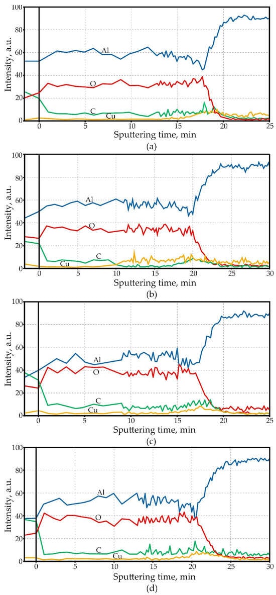 AES element distribution profile of AlCu4 oxide obtained from (а) CB 100 V anodizing at 1.72 mA·cm−2; (b) CB 100 V anodizing at 12.05 mA·cm−2; (c) CB full anodizing at 1.65 mA·cm−2; (d) CB full anodizing at 11.21 mA·cm−2. In the case of full anodizing, the anodic voltage not only reaches 100 V but also continues to be maintained until the anodic current reaches an infinitesimal value commensurate with the leakage current.