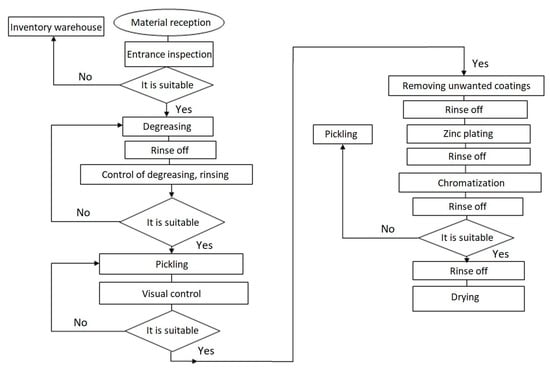 The graphical representation of the technological process is illustrated in Figure 2. The procedure is initiated with the receipt of materials via selected transport mechanisms, followed by a visual inspection of the received materials. Based on this assessment, a decision is made regarding the progression of the material to subsequent operations or its return to stock. Upon meeting the criteria, the degreasing process ensues to eliminate various impurities and greases, and is succeeded by rinsing with water.