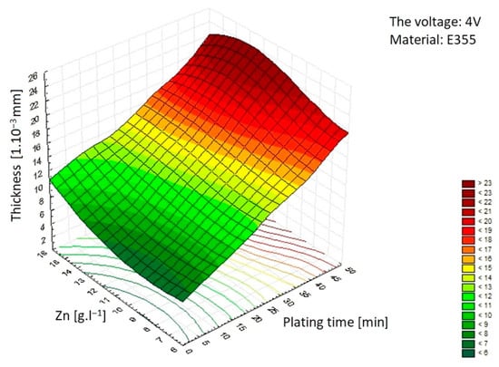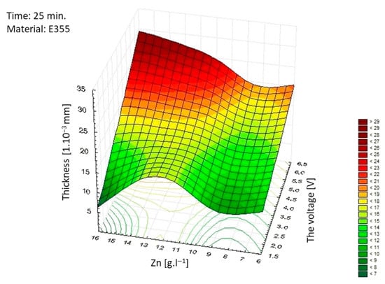 Regarding the graphical dependency shown in Figure 4, the increase in layer thickness at low voltage, which is in the range of 1.5–3 V, is within the interval of 11–13 g/L. Upon exceeding this zinc quantity in the electrolyte, a reduction in the created thickness of the zinc coating layer can be observed. A similar trend can be observed with a low amount of zinc in the electrolyte, exceeding 11 g/L. In general, it can be stated that as the voltage increases, the thickness of the deposited layer also increases.