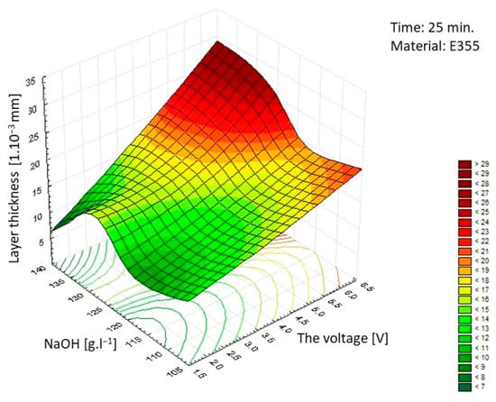 In Figure 5, it can be observed on the axis representing the sodium hydroxide quantity that there is a jump in the thickness of the deposited coating layer within the range of values from 125 to 130 g/L. In the range of sodium hydroxide content values from 105 to 125 g/L, the thickness changes very slowly. Depending on the sodium hydroxide content, it can be said that with an increase in its quantity, the layer thickness proportionally increases, and at the value of 125 g/L, there is an increase in thickness, followed by a decrease in the thickness of the deposited coating layer. In terms of voltage, it can be stated that with an increase in voltage, the thickness of the deposited zinc coating layer proportionally increases. The measured values are provided in Table 6 and Table 7.