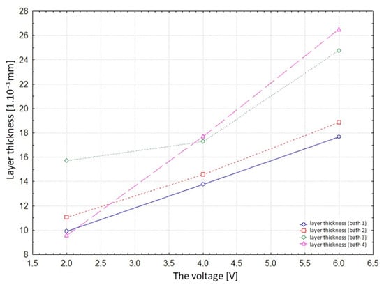 The graphical representation in Figure 8 shows that the composition of the electrolyte has a significant impact on the thickness of the deposited coating layer. The blue curve represents tank number 1. Here, in tank number 1, where the zinc content is 7.68 g/L and the sodium hydroxide content is 117 g/L, the thickness of the deposited zinc coating layer increases proportionally with the voltage. In tank number 2, depicted in red, with a zinc content of 6.54 g/L and a sodium hydroxide content of 110 g/L, a similar phenomenon can be observed as in tank number 1, meaning that the thickness of the deposited zinc coating layer increases proportionally with the voltage. In tank number 5, shown in pink, with a zinc content of 15.36 g/L and a sodium hydroxide content of 138 g/L, it can be seen that, compared to tanks number 1 and number 2, a greater thickness of the zinc coating layer is deposited at the same voltages. In tank number 4, depicted in green, after a voltage of 4 V, a similar trend can be observed as in tanks number 1 and 2, and at voltages higher than 4 V, the curve resembles the curve of tank number 4. In general, it can be said that increasing voltage values lead to an increase in the thickness of the deposited zinc coating layer. Values of Zn and NaOH content are in Table 8.