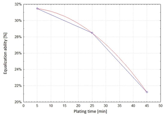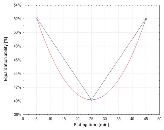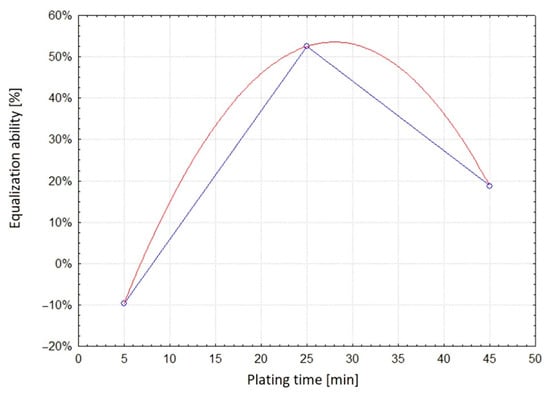 The graphical dependency shown in Figure 10 illustrates the leveling ability, expressed as a percentage, depending on the plating time at a constant voltage set to 4 V. At values of 5 and 45 min, corresponding to the minimum and maximum plating times, the maximum leveling ability of the coating was achieved. In this bath, the zinc content was 7.68 g/L, and the sodium hydroxide content was 117 g/L. The lowest percentage of leveling ability was reached at 25 min. This curve on the graph resulted from the significant influence of the bath composition, namely, the composition of zinc and sodium hydroxide, on the leveling ability.