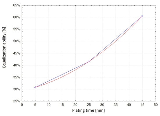 The graphical dependence of the leveling ability based on the plating time in bath number 2 is shown in Figure 11. It can be observed that, at a plating time of 5 min in bath number 2, where the zinc content is 6.54 g/L and the sodium hydroxide content is 110 g/L, the leveling ability of the coating achieved was 30%, representing the lowest value. As the plating time extended to 25 min, the leveling ability of the coating increased proportionally. A steeper increase in the leveling ability occurred after exceeding the 25 min mark. The maximum value of leveling ability, 60%, was achieved at a plating time of 45 min.