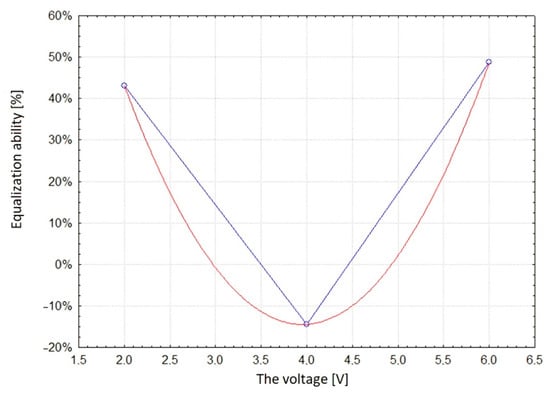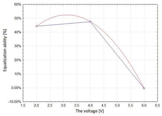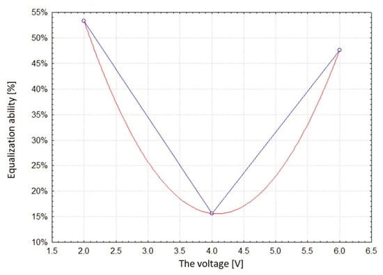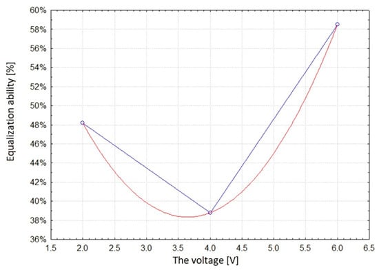 Regarding the graphical dependence shown in Figure 16 for tank 3, a similar phenomenon occurred at 2 V as in tank 1, where the leveling ability varied between 40% and 50%. Even at a voltage of 4 V, a similar effect could be observed as in tank 1, where at 4 V, the leveling ability was the lowest. The highest leveling ability value was achieved in this case at the maximum applied voltage of 6 V.