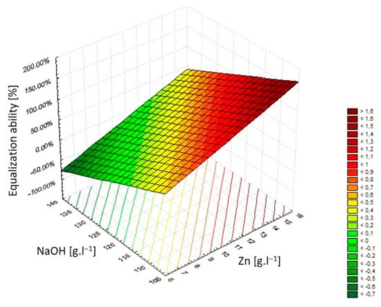 Regarding the graphical dependence shown in Figure 18, leveling ability is depicted in relation to the content of electrolyte components, specifically the content of Zn and NaOH. As the NaOH content in the electrolyte increased, the leveling ability of the deposited zinc coating decreased. Conversely, when the Zn content increased in the electrolyte, the leveling ability of the coating increased. Therefore, it can be stated that, to achieve a high leveling ability, it is necessary to mix the electrolyte so that it has the highest possible Zn content and the lowest possible NaOH content.