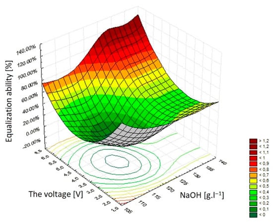 If the leveling ability of the zinc coating depends on both the voltage and the NaOH content in the electrolyte, a similar phenomenon can be observed as in the graphical dependence of the leveling ability on the voltage and Zn content. Similarly, at voltage values ranging from 3 V to 5 V, there is a decrease in the leveling ability, and at the minimum and maximum voltage values, the leveling ability increases, as shown in Figure 20.