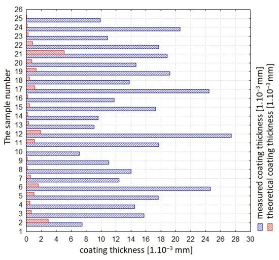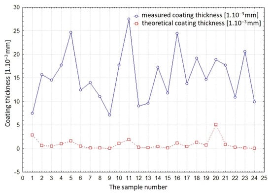 The measured and calculated (theoretical) thicknesses of the deposited zinc coating layers are depicted in the graphical dependencies in Figure 21 and Figure 22.