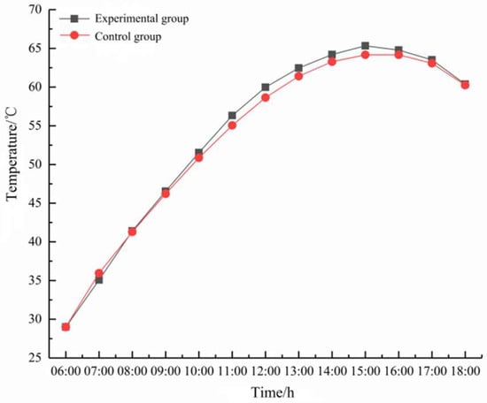 It can be seen from Figure 6 that the simulation results of this paper have the same change rule as the results of the existing research [27], and both increase with the increase in radiation intensity. However, between 6:00 and 10:00, the temperature calculation results of this paper are basically consistent with the temperature change curve in the literature results. After 10:00, the calculation results of this paper are different from those in the literature, but the difference is small. In this paper, the calculated temperature peak is 65.33 °C, which is only 1.81% larger than the existing research results, thus proving the effectiveness of the temperature field model in this paper.
