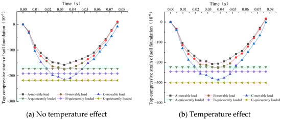It can be seen from Figure 8 that whether there is temperature effect or not, the variations in the top surface compressive strain of the three kinds of permeable asphalt pavements under dynamic load are the same as those for road surface deflection, which show half-sine variation and are constant under static load. The values of peak compressive strain of the top surface of the soil foundation of the three types of pavements under static load with temperature effect are 223 με, 246 με and 301 με, which are increased by about 30%, 28% and 38% compared with the respective values without temperature effect. The values of peak compressive strain of the top surface of the soil foundation under dynamic load with temperature effect are 208 με, 227 με and 286 με, which are increased by about 31%, 29% and 33% compared with the respective values without temperature effect. It can be seen that the peak values of the top surface compressive strain of the three types of pavements under static load are also greater than those under dynamic load. Moreover, due to the existence of the temperature effect, the compressive strain on the top surface of soil foundation has a large increase, which is similar to the road surface deflection, and the largest increase is still type C.