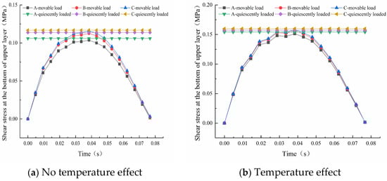 It can be seen from Figure 9 that the shear stresses at the bottom of the top surface course of the three types of permeable asphalt pavement show half-sine variation under dynamic load, and the value is fixed under static load. The peak values of the shear stress at the top surface course of the three kinds of pavements under dynamic load are less than the respective values under static load, but the differences are small. In addition, under the same conditions, the peak values of shear stress at the top layer and bottom of the three types of pavements under dynamic load and static load are about 0.10 MPa, 0.11 MPa and 0.12 MPa, respectively. However, these values increase to a certain extent under the action of temperature by about 46%, 39% and 38%, respectively. This phenomenon indicates that the existence of the temperature effect has a great influence on the shear stress of the top surface course of permeable asphalt pavements.