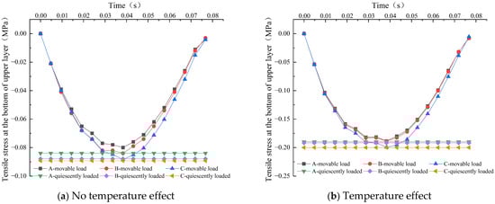 It can be seen from Figure 10 that the tensile stresses at the bottom of the top surface course of the three types of permeable asphalt pavements show half-sine variation under dynamic load, and the value is fixed under static load. At the same time, as for the shear stress at the bottom of the top surface course, the peak values of the tensile stress at the bottom of the upper layer of the three types of pavements under dynamic load are smaller than those under static load, and the differences are not large. Under the same conditions, the peak values of tensile stress at bottom of the top surface course of the three types of pavements under dynamic load and static load are about 0.19 MPa, 0.19 MPa and 0.20 MPa, respectively, which are about 0.1 MPa higher than the respective values without temperature effect, which is consistent with the conclusion that the effect of high temperature on the increase in compressive stress is not significant in the existing research [28]. This also shows that the existence of the temperature effect also has a great influence on the tensile stress of the top surface course of permeable asphalt pavements.