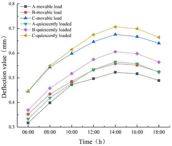 It can be seen in Figure 11 that under the action of dynamic load and static load, the surface deflection of the three types of permeable asphalt pavements has the same change rule with pavement temperature. The pavement temperature gradually increases from 6:00 to 14:00, and the deflection value at the surface load also continues to increase. The pavement temperature and deflection reach a peak at 14:00. Between 14:00 and 18:00, due to the decrease in pavement temperature, the deflection values of the load on the road surface begin to decrease. Comparing the road surface deflection values under static load and dynamic load, it can be found that at any time, the values for the same structure under static load are all greater than those under dynamic load, with C > B > A.