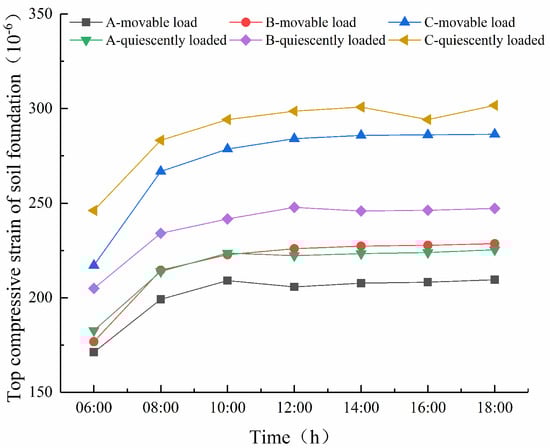 It can be seen from Figure 12 that under both static and dynamic loads, the influence of temperature change on the compressive strain of soil foundation top surface of the three types of permeable asphalt pavements is different from that of road surface deflection. In the whole loading cycle, the top surface compressive strain of the three kinds of pavements increases with the increase in temperature, but the growth rate does not increase linearly with the increase in temperature, and there is no inflection point in the 12 h heating process. The top compressive strain of the three kinds of pavements can be seen as an obvious increase from 6:00 to 8:00. After 8:00, the increase is less obvious. This is because the soil foundation at the bottom of the structure is less affected by temperature, and the slight growth is mainly due to the small modulus of the soil foundation itself. This is the same as the influence of temperature on the compressive strain of the soil foundation top surface under the action of a standard axial load (static load) under the same conditions. It can also be seen from the figure that at any time, the compressive strain values of the soil foundation top surface of the three types of permeable asphalt pavements are C > B > A.