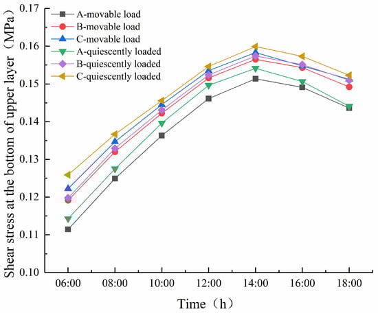 It can be seen from Figure 13 that during the heating process of 12 h, the shear stress at the bottom of the top surface course of the three types of permeable asphalt pavements is basically consistent with the change rule of surface deflection with temperature, and there is also an inflection point at 14:00. Between 6:00 and 14:00, the shear stress at the bottom of the top surface course of the three pavements increases gradually, and the values of shear stress reach a peak at 14:00. Then, the values of shear stress of the three pavements begin to decrease between 14: 00 and 18:00. Whether under static or dynamic load, the shear stress at the bottom of top surface course of the three pavements increases with the increase in temperature. At the same time, the shear stress values at the bottom of the type B and C pavements are basically equal in the whole cycle, while that of the type A pavement is smaller than the values for the B and C pavements. This observation is consistent with the findings of existing studies [20].