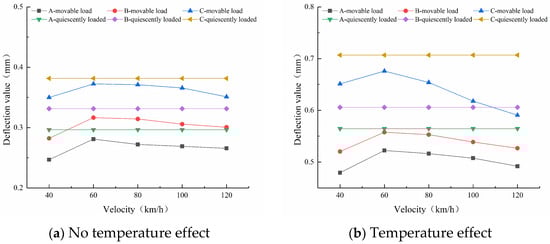 Figure 15 shows that for the three types of pavement and under the action of dynamic load, the rule of surface deflection changes with speed is equal at the same time, regardless of the temperature effect. When the speed is 40–60 km/h, the deflection value increases with the increase in speed, reaches a peak at 60 km/h, and then decreases with further increases in speed. Comparing the road surface deflection under static load at the same conditions, it can be seen that the peak value of road surface deflection under dynamic load is smaller than that under static load. In addition, for the three types of pavements, regardless of the temperature effect, the surface deflection values under the same load are C > B > A.