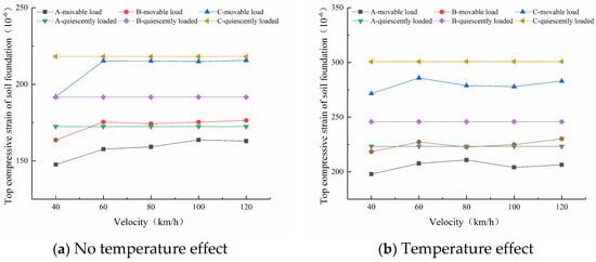 It can be seen from Figure 16 that for the three types of pavements, the variation in compressive strain of the soil foundation top surface with speed is the same with or without temperature effect. When the load reaches a peak value (1/2T), the top compressive strain of the soil foundation increases from 40 km/h to 60 km/h without the temperature effect, but the change is not obvious. The difference between the temperature effect and the non-temperature effect condition is that there is no obvious fluctuation in the whole range of speed. When the speed is less than 60 km/h, it has a great influence on the compressive strain of the top surface of the soil foundation of the pavements without temperature effect. The degree of influence decreases with the increase in speed, and the influence of the speed change on the compressive strain of the top surface of the soil foundation of the pavement with temperature effect is small over the whole range. In addition, under the same conditions, the peak compressive strain of the soil foundation top surface under dynamic load is smaller than that under static load, which is the same pattern observed for the deflection value of the road surface.