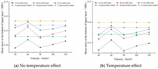 It can be seen from Figure 17 that with the increase in speed, the shear stress at the bottom of the top surface course of the three types of pavements either increases or decreases at different times. Whether the temperature effect exists or not, the changes in the shear stress at the bottom of the top surface course of these pavements are as follows: the shear stress values increase with increases in speed from 40 km/h to 60 km/h, decrease as the speed increases from 60 km/h to 80 km/h, and then increase with the speed. Therefore, whether there is temperature effect or not, the shear stress values at the bottom of the top surface course reach a maximum at the speed of 60 km/h and fluctuate between 40 km/h and 80 km/h.