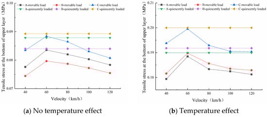 It can be seen from Figure 18 that, as for the surface deflection and the compressive strain of the top surface of the soil foundation, the three pavements have the same law of tensile stress at the bottom of the upper layer, with or without the temperature effect, at the same time. Whether there is temperature effect or not, when the speed is 40–60 km/h, the tensile stress values at the bottom of the top surface course increase with increases in speed, reaching a peak at 60 km/h, and then decrease with further increases in speed. It can be seen that the speed of 60 km/h is the turning point of the tensile stress peak at the bottom of the entire top surface course at the peak load. In addition, under the same conditions, the peak tensile stress at the bottom of the top surface course under dynamic load is less than that under static load.