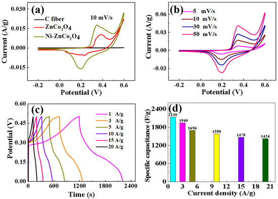 (a) Showcases the CV curves of carbon fiber, ZnCo2O4, and Ni-ZnCo2O4/CF, conducted at a scanning speed of 10 mV·s−1. (b) Illustrates the CV curves of Ni-ZnCo2O4/CF composites at varying scanning speeds of 5, 10, 30, and 50 mV·s−1. (c) Presents the charge/discharge diagrams of Ni-ZnCo2O4/CF composites at assorted current densities. (d) Depicts the specific capacitance diagram of Ni-ZnCo2O4/CF composites across multiple current densities.