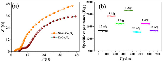 Figure 7a shows the impedance curves of ZnCo2O4/CF material and Ni-ZnCo2O4/CF material. The curves in the figure consist of high and low frequencies, with the high-frequency region representing the impedance of the ions passing through the surface film of the electrode material and the low-frequency region representing the charge-transfer impedance. In general, the value of the horizontal axis indicates Rs, and its value can be read according to the intercept of the curve and the horizontal axis; it can be seen that the intercept of the Ni-ZnCo2O4/CF material is smaller than that of the ZnCo2O4/CF material, which proves that the Ni-ZnCo2O4/CF material has good electrical conductivity. The diameter of the curve similar to a semicircle in the high-frequency region is denoted as Rct, and the value of Rct is correlated with the semicircle diameter; it can be seen in the figure that the radius of the Ni-ZnCo2O4/CF material is smaller than that of the ZnCo2O4/CF material, indicating that the Ni-ZnCo2O4/CF has a good charge-transferring ability. Figure 7b illustrates the cyclic stabilization properties of the material at different current densities after repeating 100 cycles. As shown, at a current density of 15 A·g−1, the material has a specific capacitance of 1470 F·g−1. After every 100 changes, the current density was restored to 15 A·g−1, and its specific capacitance was 1456 F·g−1, which was 99.0% of the original specific capacitance. The results show excellent multiplicity performance and cycling stability at different current densities, and the decrease in the specific capacity of the materials is very small, which is due to the fact that a few materials cannot fully participate in the reaction, and a few irreversible changes during the process of current increase.