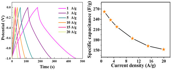 First, the experiment was conducted to test the negative electrode material to explore the electrochemical performance of this material under different currents, as shown in Figure 9. Figure 9 shows the charging/discharging curves of CNTs electrodes at different current densities. The constant-current charging and discharging curves are triangularly symmetric, indicating good reversibility of charging and discharging. The specific capacities of the CNTs electrodes were calculated as 262, 238, 218, 184, 162, and 152 F·g−1 based on the discharge curves at current densities of 1, 3, 5, 10, 15, and 20 A·g−1, respectively.