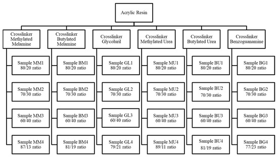 Twenty-five varnish samples were produced with resin/crosslinker ratios equal to or close to the industrial standard formulation to assess variations in performance. Varnish types 1, 2, and 3 had different proportions, with type 1 consisting of 80% resin to 20% crosslinker; type 2 was composed of 70% resin to 30% crosslinker; and type 3 comprised 60% resin to 40% crosslinker. For type 4, stoichiometry was calculated based on the functionality of each raw material tested. Figure 2 illustrates the nomenclature of the varnish samples with their resin-to-crosslinker ratio.