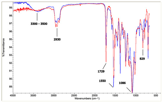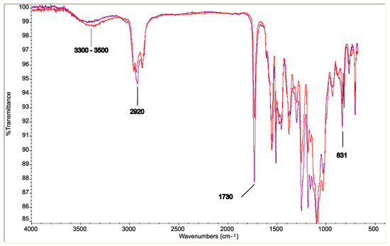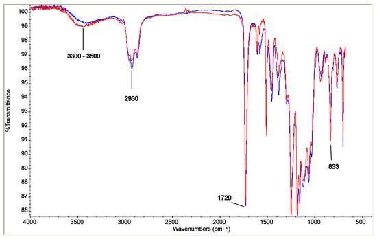 The peaks around 1700 cm−1 correspond to carboxylic acid groups from the acrylic resin. The presence of these groups is essential, but an excess of them can increase the solubility of the varnish in water.