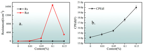 The impedance spectrum was fitted to obtain the equivalent circuit parameter, Table 1, and the equivalent circuit parameter variation, Figure 6. The increasing capacitance of the coating is caused by the increasing pseudocapacitance provided by the oxygen-containing functional groups on the surface of graphene oxide []. It can be seen that the coating resistance first increases and then decreases with the content of GO, reaching the maximum value when the content is 0.1 wt. %. Although the sheet graphene oxide has a barrier effect and can delay the penetration of corrosive media, the presence of hydrophilic groups weakens its anti-corrosion performance. Therefore, when a small amount of graphene oxide is added, it is easy to evenly disperse and can effectively play a blocking role. However, with the increase in the addition, the hydrophilicity of the coating is enhanced, resulting in the agglomeration of the graphene oxide, which leads to the decrease in the coating resistance. Therefore, when the amount of GO was 0.15 wt. %, the corrosion resistance began to decrease. The coating capacitance in electrochemical impedance spectroscopy has been proved to be a key parameter to measure the water permeability of the coating []. The coating capacitance CPEdl increases with the increase in the graphene oxide content, because CPEdl represents the dielectric property of the coating, and the coating gradually increases during the process of being gradually permeated by electrolytes []. The more graphene oxide in the coating, the easier the electrolytes in the coating will penetrate into the coating due to its hydrophilicity, thus increasing the coating capacitance.