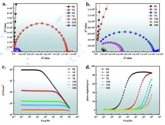 EIS has been widely used in the study of coating protection and aging mechanisms. The resistance of a coating is an important index to evaluate its corrosion resistance, and the capacitance value can reflect the ability of coating to allow electrolytes to penetrate. In addition, the corrosion rate of the metal under the coating can be understood by estimating the reaction resistance []. Generally speaking, the arc radius of capacitive reactance in a Nyquist diagram is inversely proportional to the corrosion rate: the smaller the radius, the faster the corrosion rate of the coating. Conversely, the larger the radius, the slower the corrosion rate []. As shown in Figure 8a,b, the arc resistance of the composite coating is semi-circular, indicating that the electrode process is mainly controlled by charge transfer. And the effect caused by impedance is negligible. With the extension of soaking time, the arc radius of the composite coating decreases gradually, and the corrosion resistance weakens gradually. In the simulated corrosion experiment of seawater for 28 days, no second arc resistance appeared, indicating that no corrosion products were formed, which confirmed the excellent corrosion resistance of the composite coating. At the initial stage of immersion, seawater quickly permeates the coating, enhancing the ion conductivity. It results in a sharp decrease in the coating resistance and a significant change in the impedance spectrum. With the extension of soaking time, the penetration rate of seawater slows down, and the change in coating resistance is gradually stable. The change in capacitance–reactance spectrum characteristics decreases. When the soaking time exceeds 350 h, the coating resistance shows a downward trend again, which indicates that corrosion occurs at the interface between the coating and the metal, resulting in local peeling of the coating []. As shown in Figure 8c,d, the impedance mode value of the composite coating in seawater, |Z|, gradually decreases with the increase in time, and the phase angle curve gradually shifts to the right with the increase in time, which reflects the continuous decrease in the coating resistance and the gradual decline of corrosion resistance, whose changing speed is consistent with that of the Nyquist diagram.