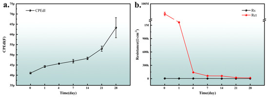 Figure 9 shows the variation trend of CPEdl, Rs and Rct in the composite coating equivalent circuit diagram. At the initial stage of immersion, water permeates the coating evenly, and the double electric layer capacitance of the coating increases slowly. Before 350 h, the water absorption in the composite coating gradually reaches saturation. The capacitance gradually increases, and the increase rate gradually slows down. This corresponds to the ion transport process inside the composite coating, which is the incubation stage when the coating substrate begins to corrode. The coating capacitance begins to change greatly, indicating that the interface between the coating and the substrate at this time is locally foamed and stripped due to the immersion of the corrosive medium, which leads to a substantial increase in the coating capacitance, and the coating begins to fail at this time and the substrate corrosion begins []. The coating resistance Rct changes greatly in the initial stage. The reason is that at the initial stage of composite coating immersion the penetration of water to the coating can significantly promote the ion conductivity of the coating, resulting in a large change in the coating resistance after one day and four days of immersion. After that, the water molecules in the coating gradually approach saturation, and the ion conductivity changes little, resulting in a small change in the coating resistance.
