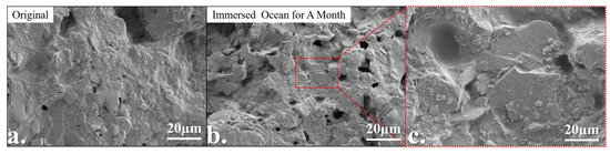 Comparison of the micromorphology of composite coating G10 after 28 days of immersion in simulated seawater: (a) The original morphology of the coating, the morphology of the coating after 28 days of immersion in simulated seawater figure (b), and the local enlarged figure (c).