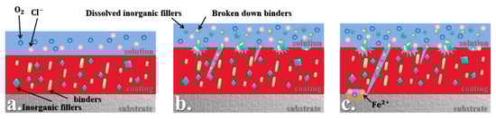 Failure mechanism of composite coating G10 coating in simulated seawater. (a) At the initial stage of immersion; (b) at the middle stage of immersion; (c) at the beginning stage of late immersion.