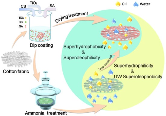 Schematic illustration of the fabrication process of the pH-responsive coated materials using cotton fabric as an example and the transformation of wettability between superhydrophobicity and underwater (UW) superoleophobicity by ammonia and heating treatment [32]. Copyright 2020. Reproduced with permission from Elsevier.