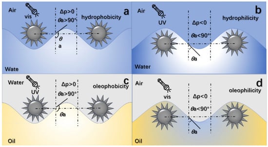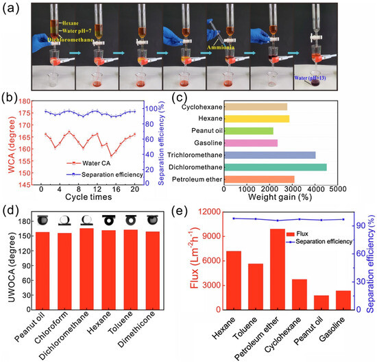 Intelligent response materials with tunable wettability surfaces that change with the environment are of great significance in oil–water separation. Jinping Ren prepared a unique pH-responsive bio-based oil–water separation material. Environmentally friendly chitosan (CS), stearic acid (SA), and low-cost titanium dioxide (TiO2) were used to form superhydrophobic TiO2@SA/CS coating. Under ammonia treatment, the coating material can transform from superhydrophobic to superhydrophilic, and the superhydrophobicity was restored through heating treatment (Figure 4). The stimulus response surface of this material was used to separate oil/water/oil mixtures and effectively separate various surfactant-stabilized oil in water lotions and water-in-oil emulsions before and after the wettability conversion (Figure 5). These results will provide new prospects for the exploration of intelligent responsive water–oil separation materials [32,33,34,35].