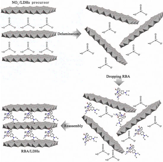 The preparation process of supramolecular RBA/LDHs [61]. Copyright 2021. Reproduced with permission from Elsevier.