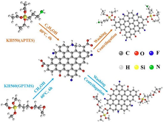 Fluorinated graphene (FG), as a derivative of graphene, possesses excellent insulation properties, but its dispersibility in organic coatings remains a difficulty in anticorrosion applications. Lin X proposed a simple method to effectively strengthen the dispersibility of FG and enhanced its interfacial compatible ability with epoxy resin. FG was modified with epoxy-terminated 3-glycidyloxypropyltrimethoxysilane (GPTMS) and amino-containing 3-aminopropyltriethoxysilane (APTES) (Figure 8). The results indicated that silane coupling agent significantly improved the dispersion ability of FG in epoxy coatings and enhanced the interfacial interaction between epoxy resin and FG, thus improving the barrier performance of epoxy coatings and stopping the penetration of corrosive media [72,73,74].