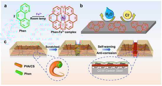 Schematic of the self-warning and self-healing synergetic process of the composite coatings loaded with PVA/CS. (a) The structure of Phen, (b) Phen is an excellent and stable π electron acceptor, and its adsorption on the surface of carbon steel follows the Langmuir adsorption isotherm. (c) Within seconds of contact with Fe ions, the color changes from yellow to red to achieve the purpose of naked-eye observation [82]. Copyright 2022. Reproduced with permission from ACS.