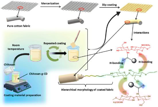 Coating process of textile and plausible interactions [93]. Copyright 2022. Reproduced with permission from ACS.