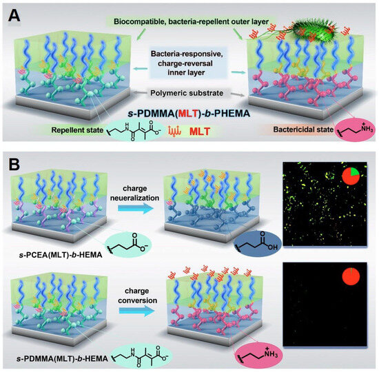 Liu T. proposed a graded polymer brush system and easily constructed it on a polymer substrate through photoactive grafting polymerization. The polymer brush system exhibited a unique hierarchical structure, consisting of an outer layer of poly (hydroxyethyl methacrylate) (PHEMA) and an inner layer of anions loaded with cationic antimicrobial peptides through electrostatic attraction. The surface of the system inhibited the initial adhering of bacteria through the outer layer of PHEMA hydration under neutral pH conditions. When bacteria adhered and proliferated on the surface, bacterially induced acidification triggered the breaking of unstable amide bonds in the inner layer, exposing amines of positive charge and violently releasing melittin (MLT), allowing the surfaces to kill the adhered bacteria in a timely manner (Figure 12). The graded surface adopted various antibacterial mechanisms to fight bacterial infections and exhibited high sensitivity and responsiveness to pathogens [95].