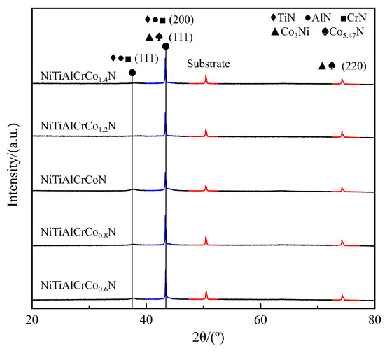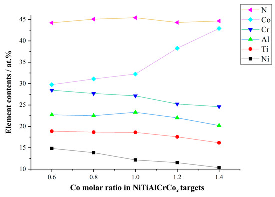 Table 3 and Figure 4 show the element contents of NiTiAlCrCoxN films with different Co contents, which was observed by EDS. The N contents in NiTiAlCrCoxN films are about (39 ± 0.6) in percentage. The Co contents in NiTiAlCrCoxN films increase from 9.4% to 22.53% with an increase in the Co molar ratio in the NiTiAlCrCox targets. The other elements such as Ni, Ti, Al and Cr in NiTiAlCrCoxN films are approximately equal.